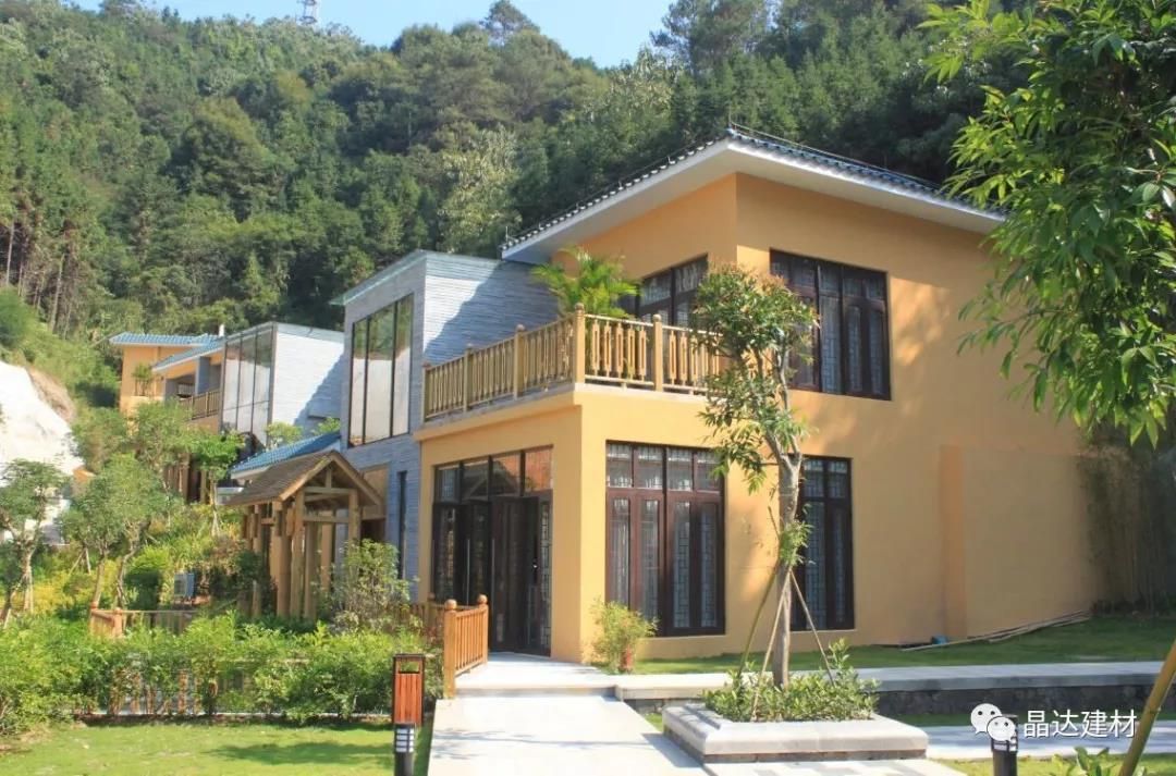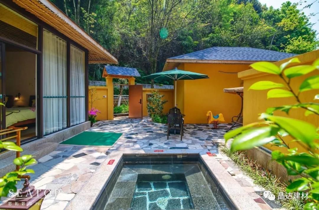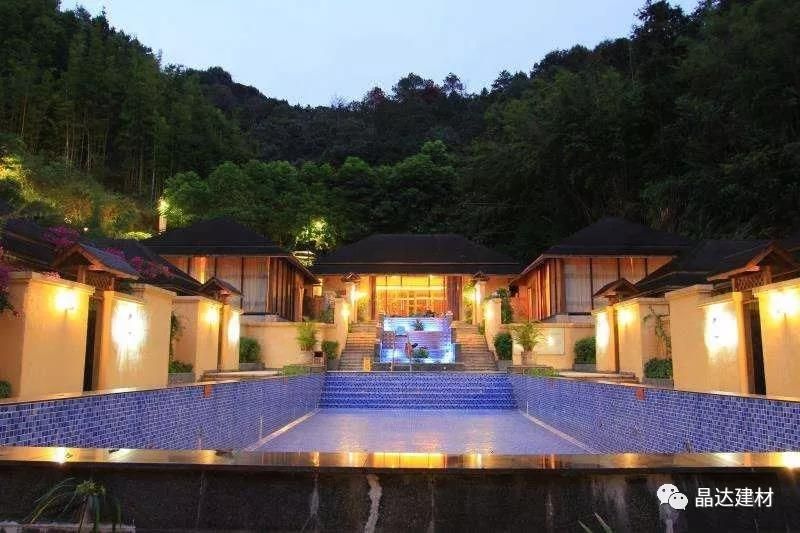 除亭臺與長廊外,“新西湖”瀝青瓦也因其優良的品質,被大量運用于酒店別墅坡屋面中。以其大氣典雅的調性,與黃色系墻面搭配拼接,彌補了黃色本身過于羸弱的色彩印象,大大提升了建筑整體的神韻氣場。