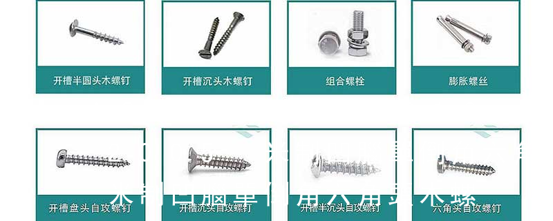 1.機螺釘 2.自攻螺釘 3.鉆尾螺釘 4.墻板釘 5.纖維板釘 6.木螺釘7.六角木螺釘 8.不脫出螺釘 9.組合螺釘 10.微型螺釘 11.家具螺釘 12.電子螺釘頭型:1.六角頭(hexagon head) 2.六角頭法蘭面(hexagon head with flange) 3.